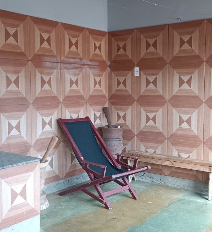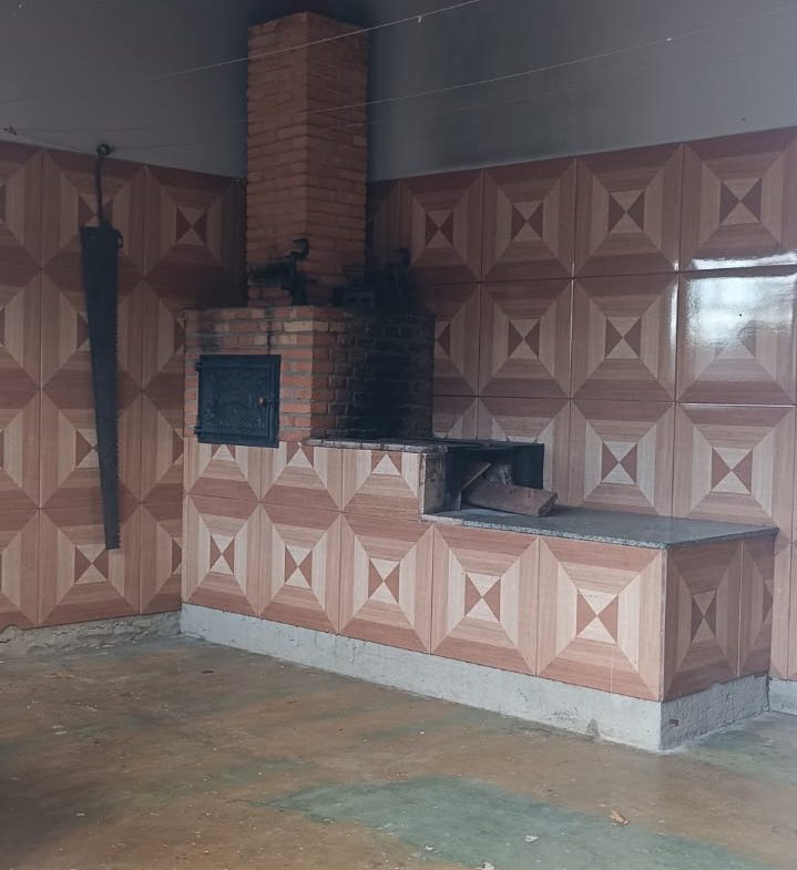 Área gourmet com fogão a lenha e mais dois cômodos.