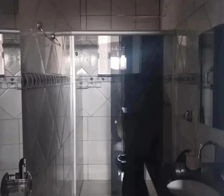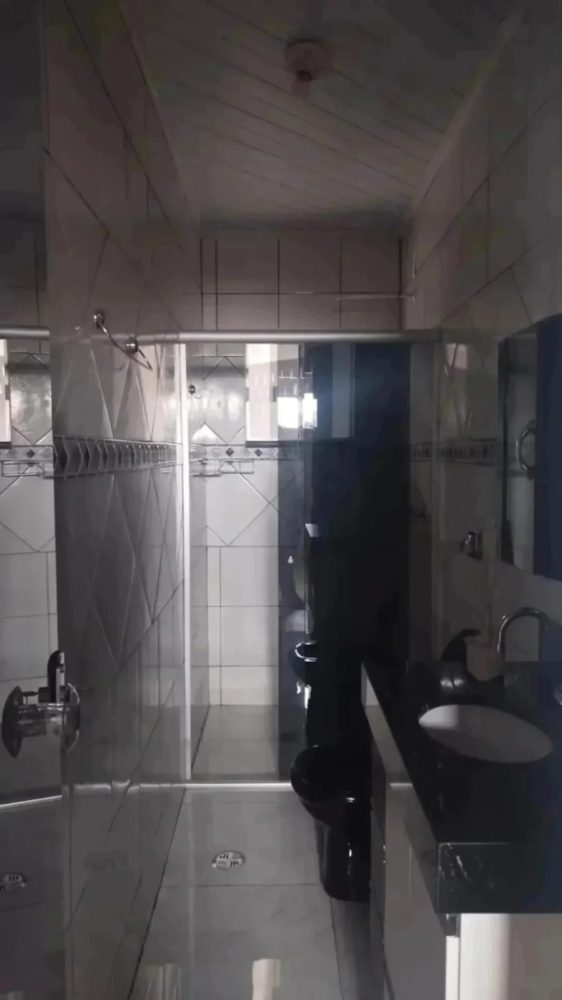 Banheiro social toda revestimento em cerâmica com box, armário.