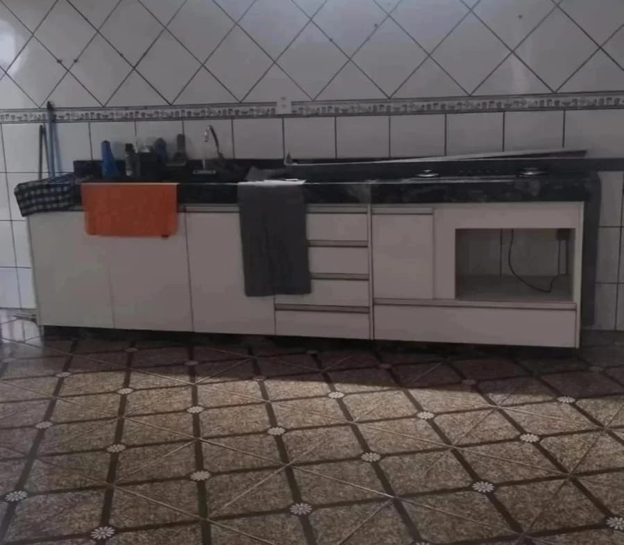 Cozinha toda revestimento em cerâmica com balcão em granito com armário embaixo com fogão Fischer.